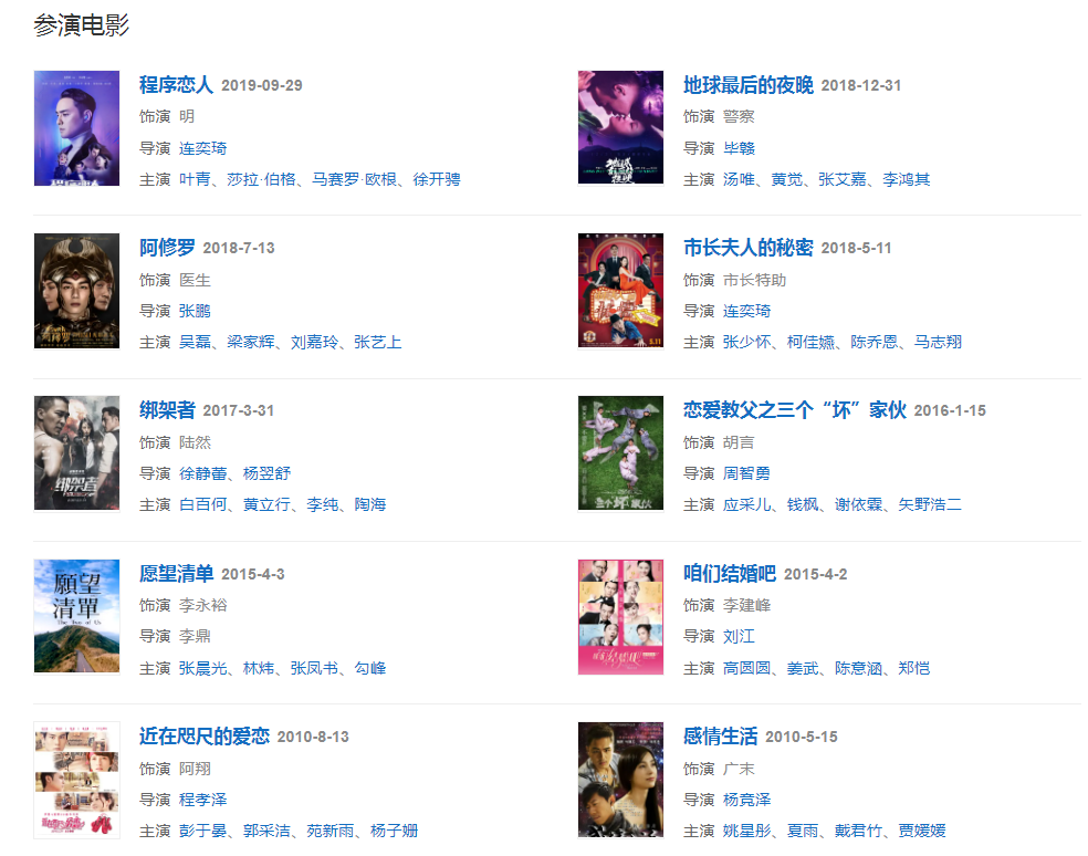 2009年,出演個(gè)人首部電影《感情生活》,并獲得“澳門國際電影節(jié)”最佳男配角獎(jiǎng)的提名;隨后,出演個(gè)人首部古裝劇《嫦娥》。