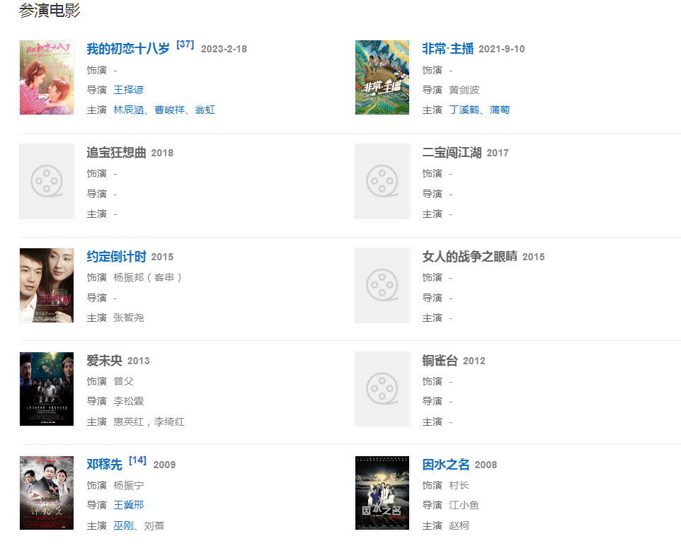 2009年,在建國(guó)60周年獻(xiàn)禮影片《鄧稼先》中扮演楊振寧,該影片獲得了大學(xué)生電影節(jié)組委會(huì)大獎(jiǎng)。