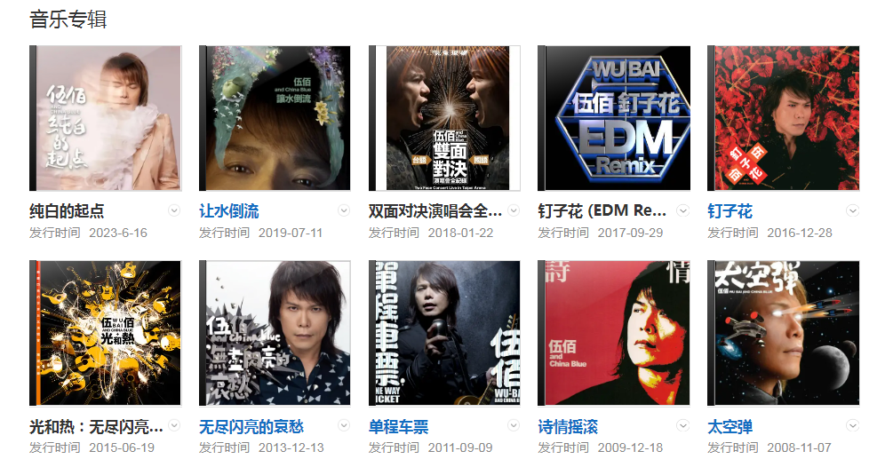 截至2020年,伍佰共發(fā)行28張個(gè)人專輯,臺(tái)灣區(qū)專輯總銷量累計(jì)超過500萬張。