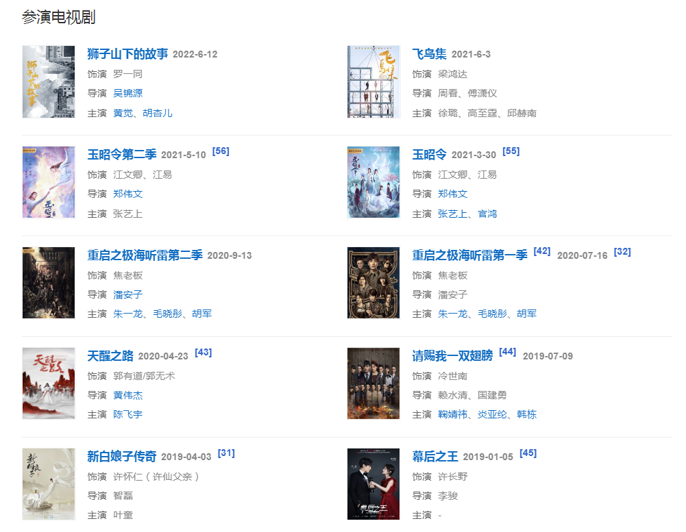 代表作品:南海十三郎、仙劍奇?zhèn)b傳、長恨歌、梨花夢、醫(yī)者仁心、記憶之城、那年花開月正圓