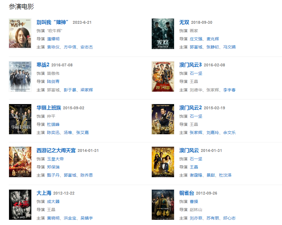 代表作品:上海灘、英雄本色、賭神、喋血雙雄、縱橫四海、秋天的童話、臥虎藏龍、無(wú)雙、讓子彈飛、龍虎風(fēng)云、辣手神探、阿郎的故事