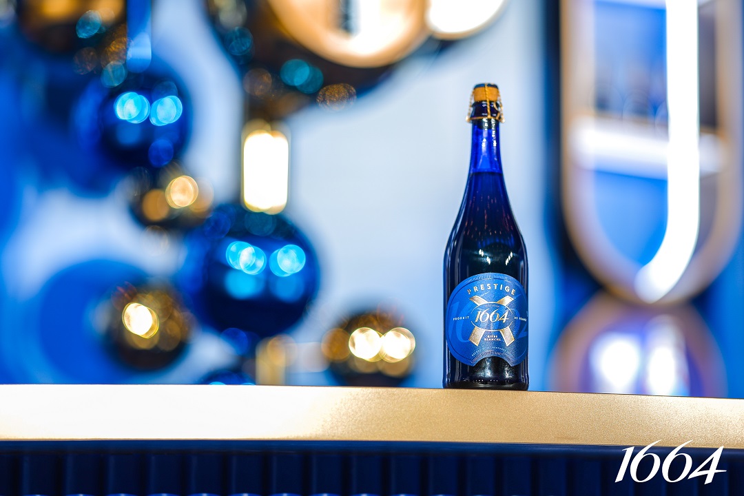 舞臺(tái)左側(cè)客廳打造相聚時(shí)的溫馨場(chǎng)景,經(jīng)典小藍(lán)瓶搖身一變,化為藝術(shù)裝飾品。倚于一旁沙發(fā),啟瓶對(duì)飲,就此開(kāi)啟歡聚時(shí)分。熱巴利用Blanc白啤藍(lán)瓶DIY星空瓶,并通過(guò)解鎖趣味挑戰(zhàn)為現(xiàn)場(chǎng)和直播間的朋友們送上多重大獎(jiǎng),與大家分享法式甜蜜。1664 Blanc白啤作為享譽(yù)全球的經(jīng)典小麥白啤酒,藍(lán)瓶白標(biāo)與柑橘元素搭配,輕酌一口,清新的口感伴隨著淡淡的果香在舌尖躍然跳動(dòng)。
