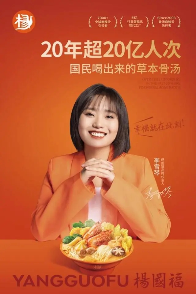 4月23日,楊國(guó)福麻辣燙正式官宣了一位神秘嘉賓——那就是我們熟悉的中國(guó)內(nèi)地女藝人李雪琴!她作為楊國(guó)福麻辣燙的首位品牌代言人,將攜手開(kāi)啟一段全新的旅程——“20年超20億人次,國(guó)民喝出來(lái)的草本骨湯”的品牌篇章。