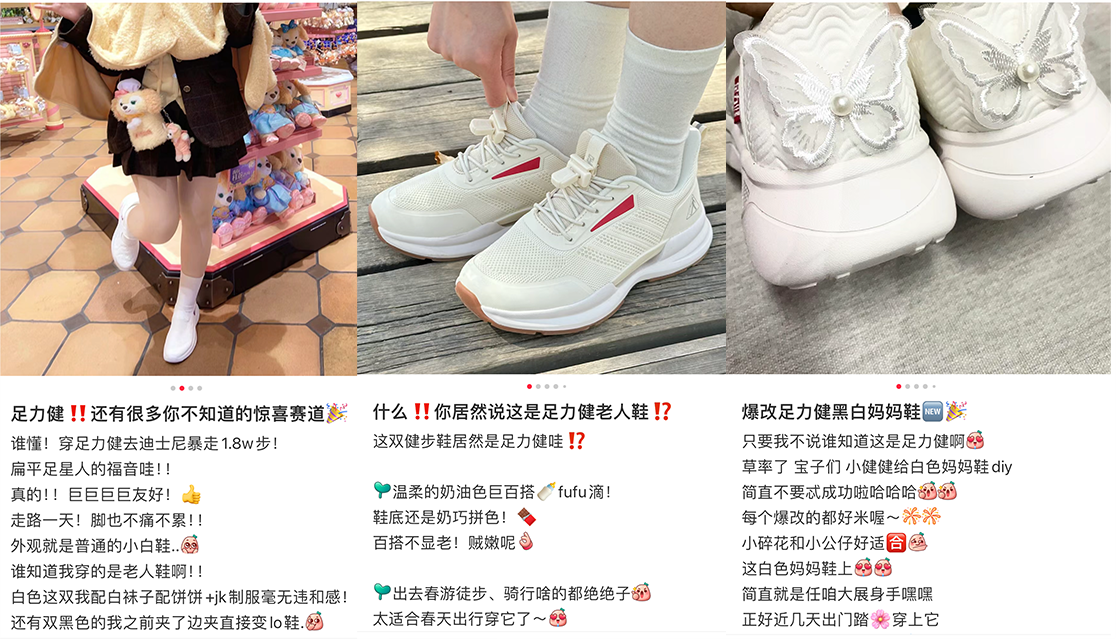 在過去的十年里,足力健憑借其卓越的產(chǎn)品品質(zhì)和精準(zhǔn)的市場(chǎng)定位,在老年人群中贏得了廣泛的贊譽(yù),穩(wěn)坐老人鞋行業(yè)“頭把交椅”。然而,足力健并未止步于此,而是敢于“擴(kuò)圈”,通過老人鞋來觸動(dòng)年輕消費(fèi)者的心。在小紅書上搜索“足力健”“爆改足力健黑白媽媽鞋”“跟風(fēng)diy足力健好看到了心巴”“足力健爆改瑪麗珍”等話題和調(diào)侃收獲了眾多互動(dòng)。足力健通過差異化的內(nèi)容運(yùn)營(yíng),萃取獨(dú)特的產(chǎn)品元素,對(duì)原有風(fēng)格進(jìn)行再創(chuàng)新,從而精準(zhǔn)地與不同屬性的人群溝通。讓年輕人覺得穿足力健是時(shí)尚、也是潮流。在新的價(jià)值觀體系上,足力健構(gòu)建了更符合當(dāng)下時(shí)代的獨(dú)特話語(yǔ)體系,成功破圈年輕群體,贏得了更多年輕消費(fèi)者的認(rèn)同。