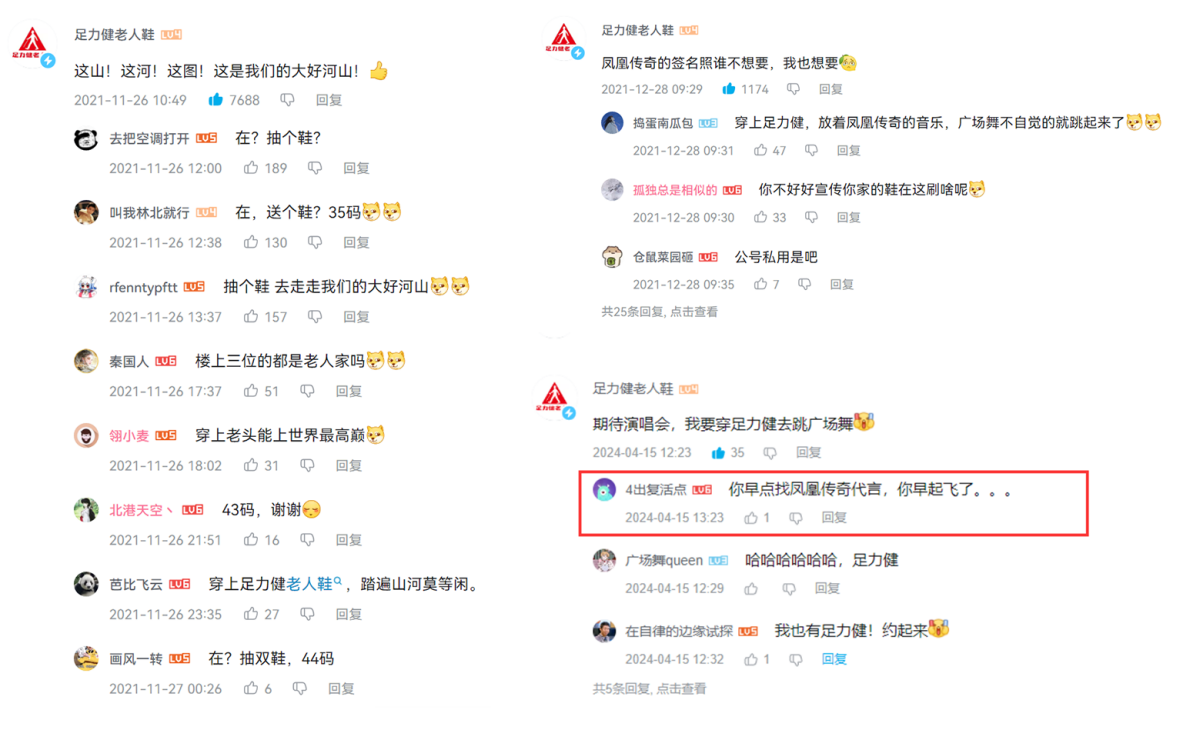 此次與鳳凰傳奇的合作,為何能擦出如此奇妙的火花?事實(shí)上,在社交APP平臺(tái)中,不乏早期“難道沒覺得足力健與鳳凰傳奇不謀而合”的期待,也有近期“早點(diǎn)找鳳凰傳奇代言足力健早起飛了”的調(diào)侃。網(wǎng)友的玩梗讓人會(huì)心一笑,但新的攜手可以再創(chuàng)高光。