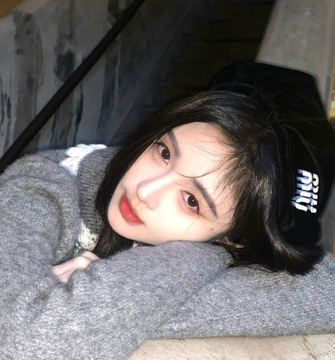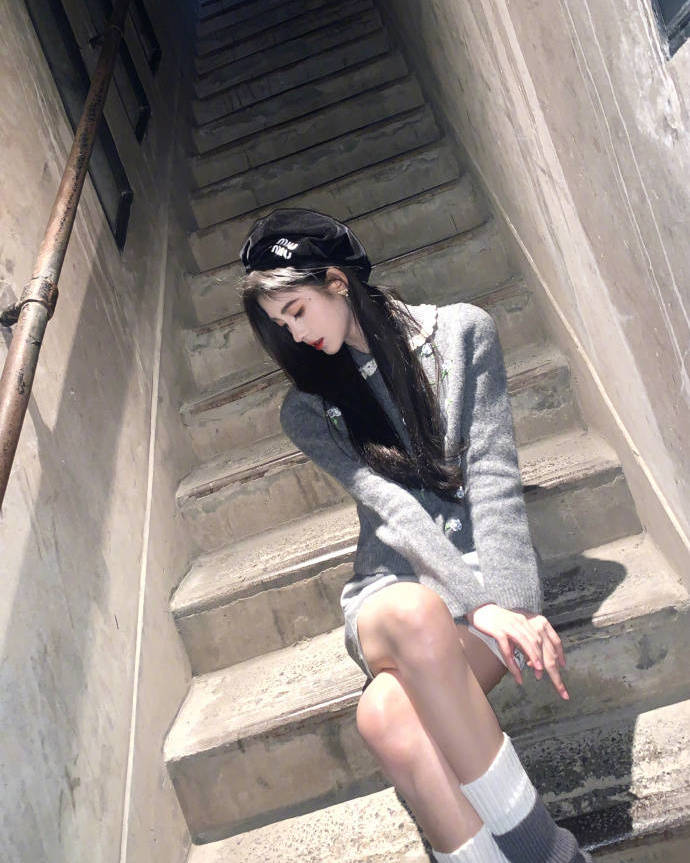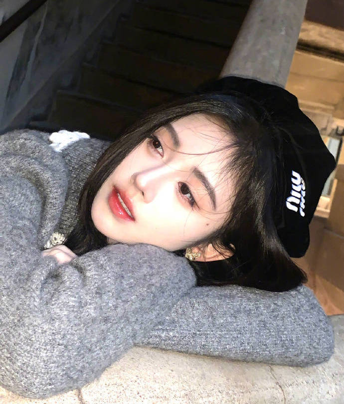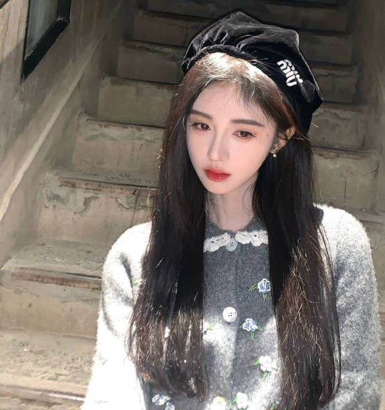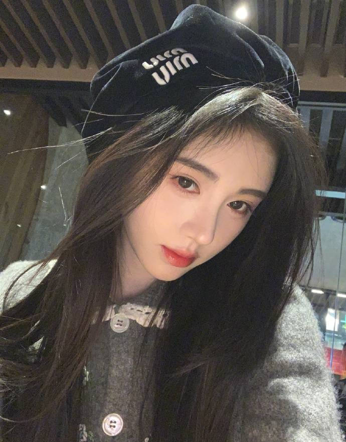 鞠婧祎身穿灰色毛衣搭配黑色貝雷帽。
