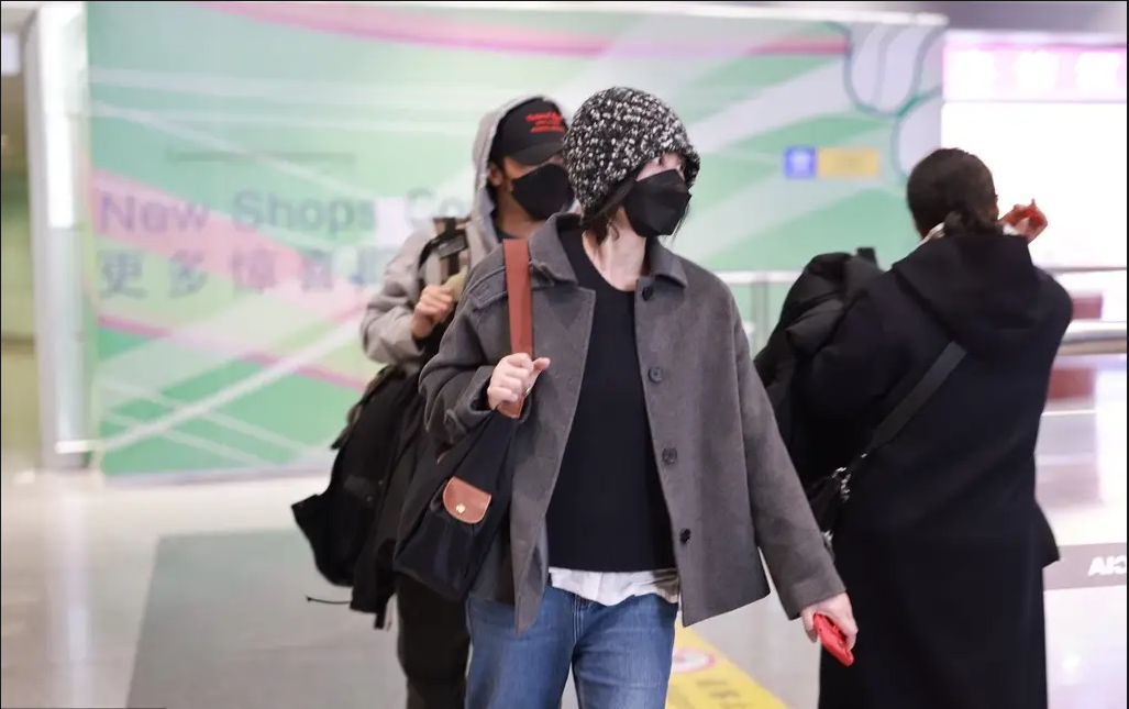王菲頭戴字母針織帽,穿黑色內(nèi)搭、深灰色外套,搭配牛仔褲,十分休閑。