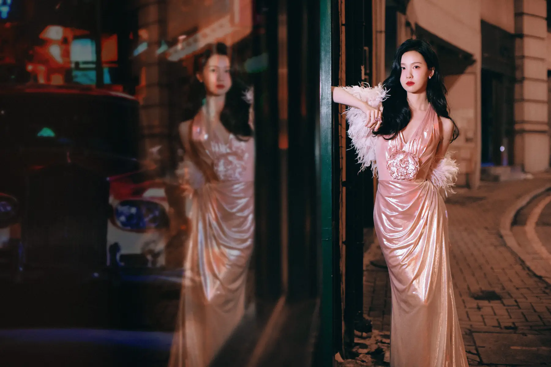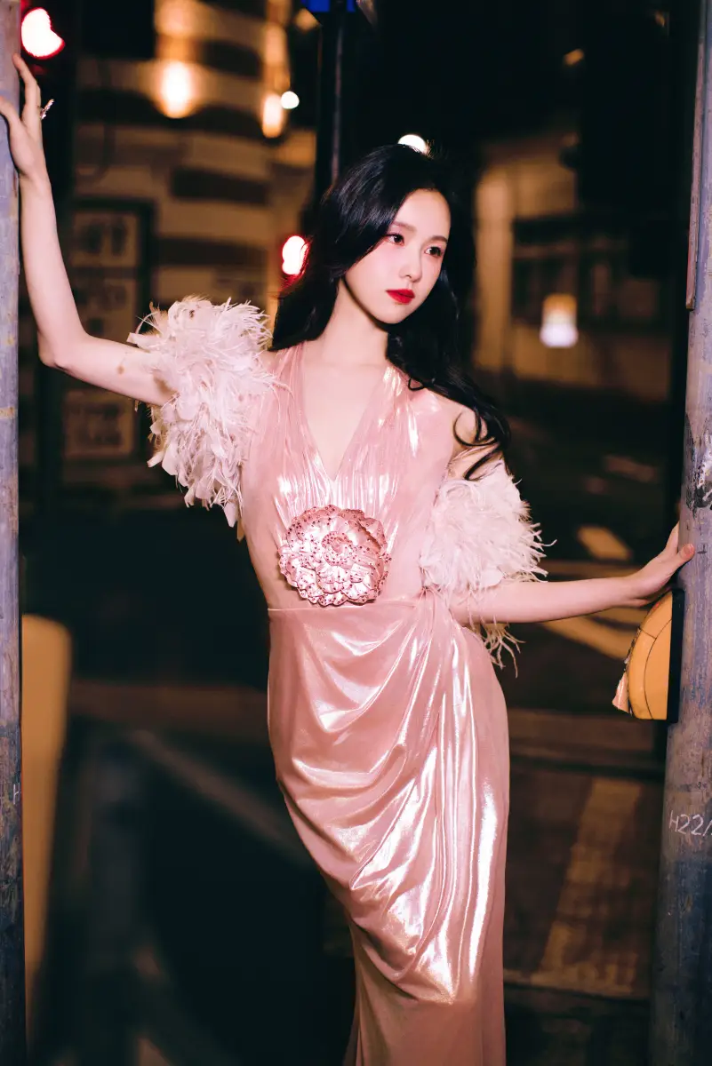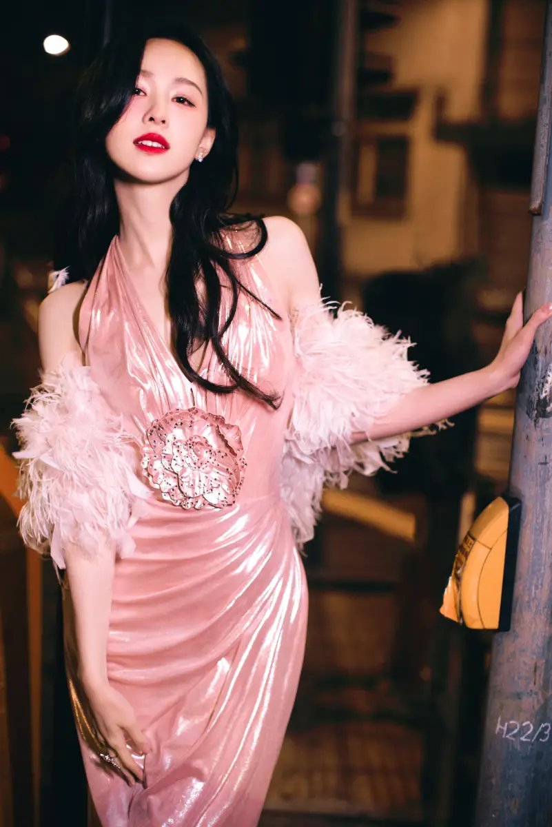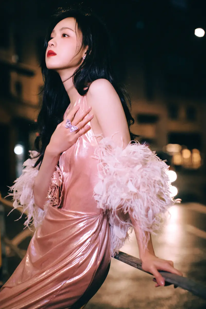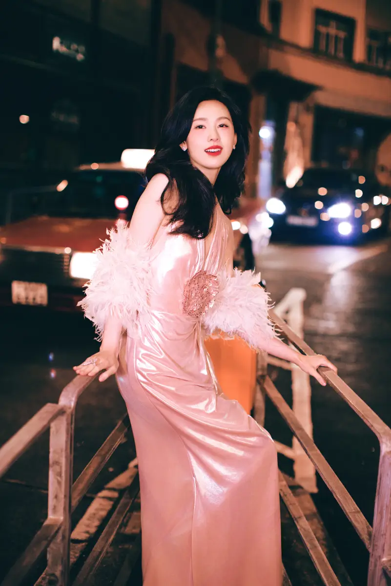陳都靈一襲粉色羽毛亮片禮服,在香港夜色中顯得尤為動人。
