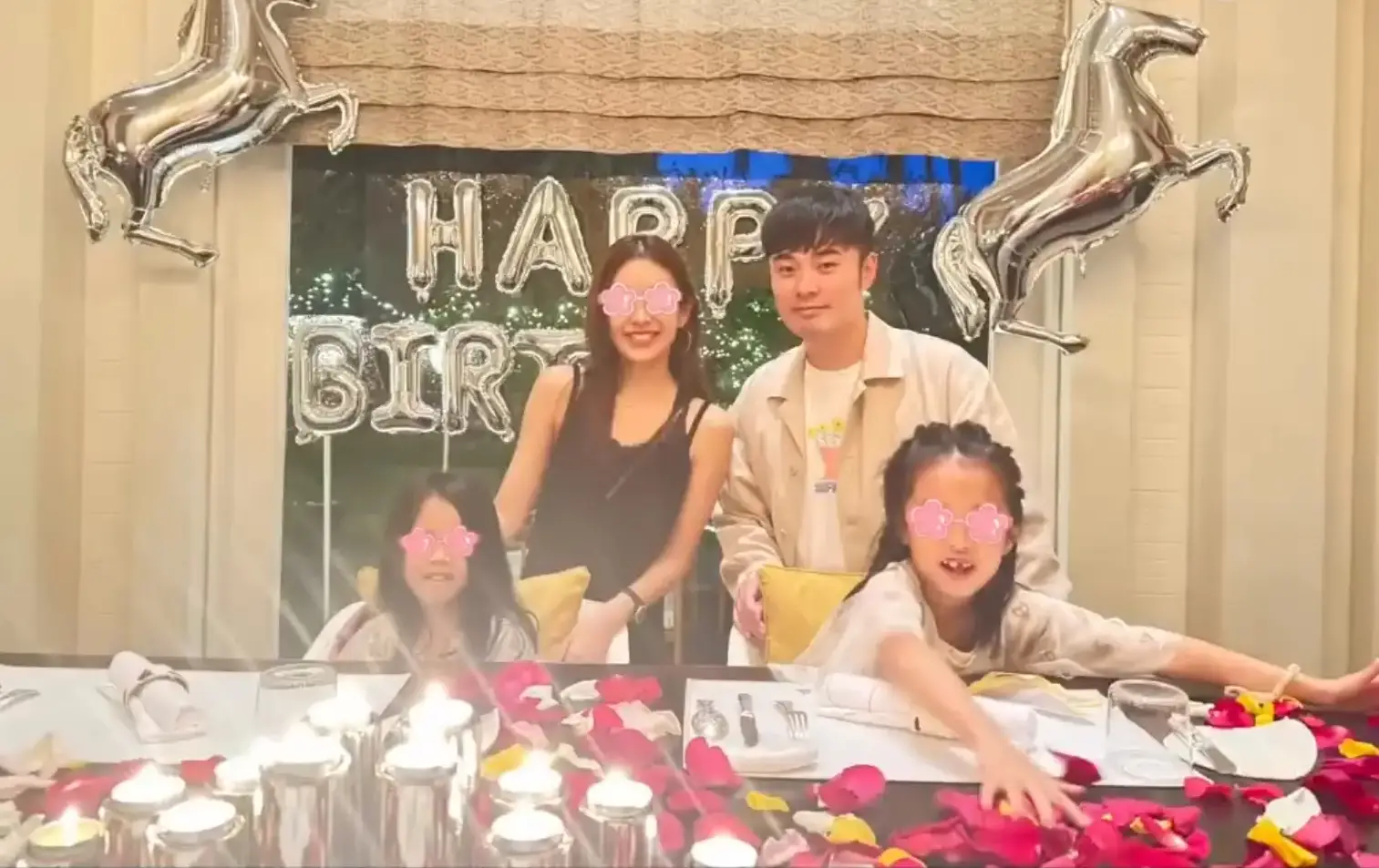 陳赫與張子萱兩人一左一右地坐在女兒們兩邊,對鏡頭干杯。